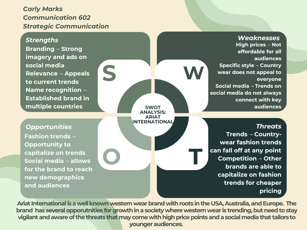 As part of my COMM 602: Strategic Communication coursework, I conducted a comprehensive SWOT analysis for Ariat International. This project involved evaluating the company’s internal strengths and weaknesses alongside external opportunities and threats within a competitive retail landscape. Through this analysis, I developed strategic insights to inform the brand’s advertising and future communication efforts. The experience strengthened my ability to think critically and apply research-driven strategy to real world organizations.