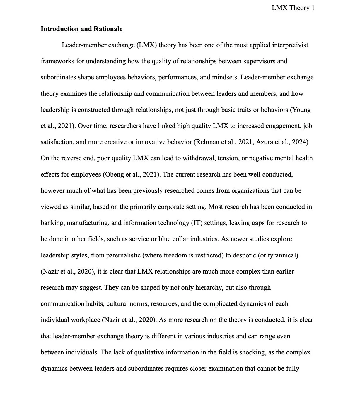 As part of my COMM 600: Theories of Communication coursework, I wrote a comprehensive literature review on Leader-Member Exchange (LMX) theory. This research deepened my understanding of relational dynamics in communication, especially within the workplace, and laid a strong theoretical foundation for my master’s thesis. The project reflects my ability to synthesize scholarly research and apply theory to real-world communication contexts. Read more about my Master’s thesis in the below section.