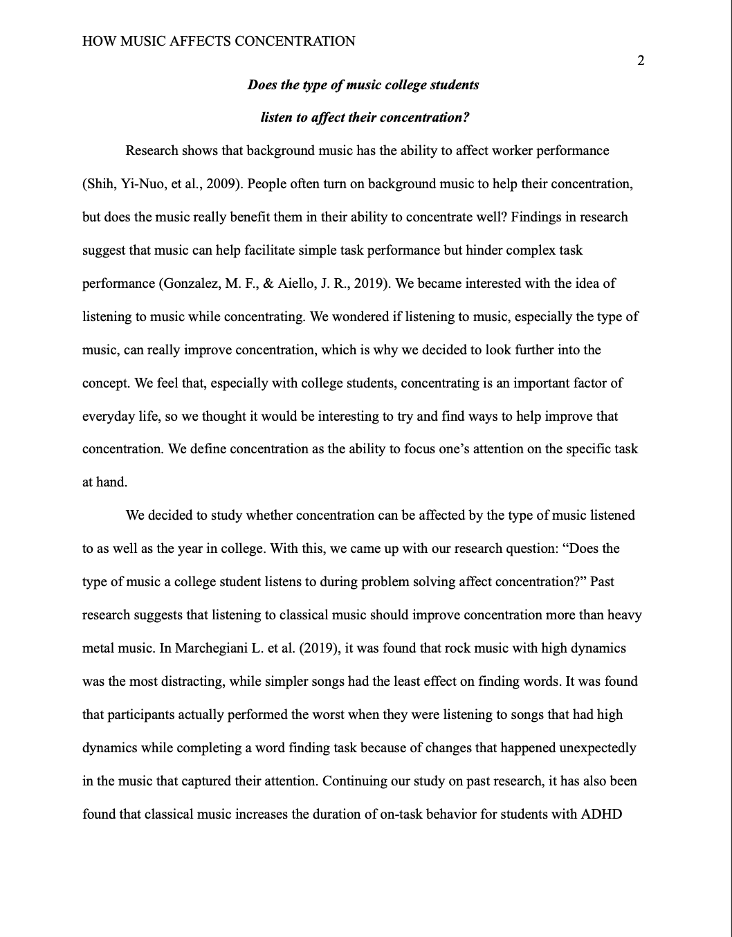 My college journey began in 2019, where I started as a freshman at Saint Mary’s College of California. Throughout my undergraduate experience, I had the opportunity to take a variety of Psychology courses, gaining insight into new fields and doing hands on work in Psychobiology, Criminal Psychology, Psychology of Family, Personality Psychology, and more. Attached is a collaborative research study and final paper on the effects of music on concentration, done during my third year Psychology 103: Methods and Analysis course.